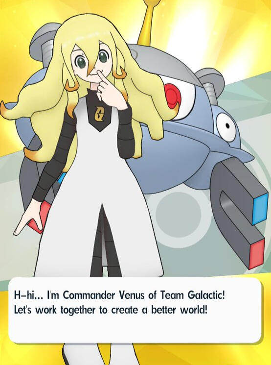 The two have a shared interest in science. They are big nerds in love lol-When Venus is promoted from a scientist to a commander, they are given the task to recruit others to Team Galactic, but after meeting a lot of different kind of people and being close with the other commanders, they